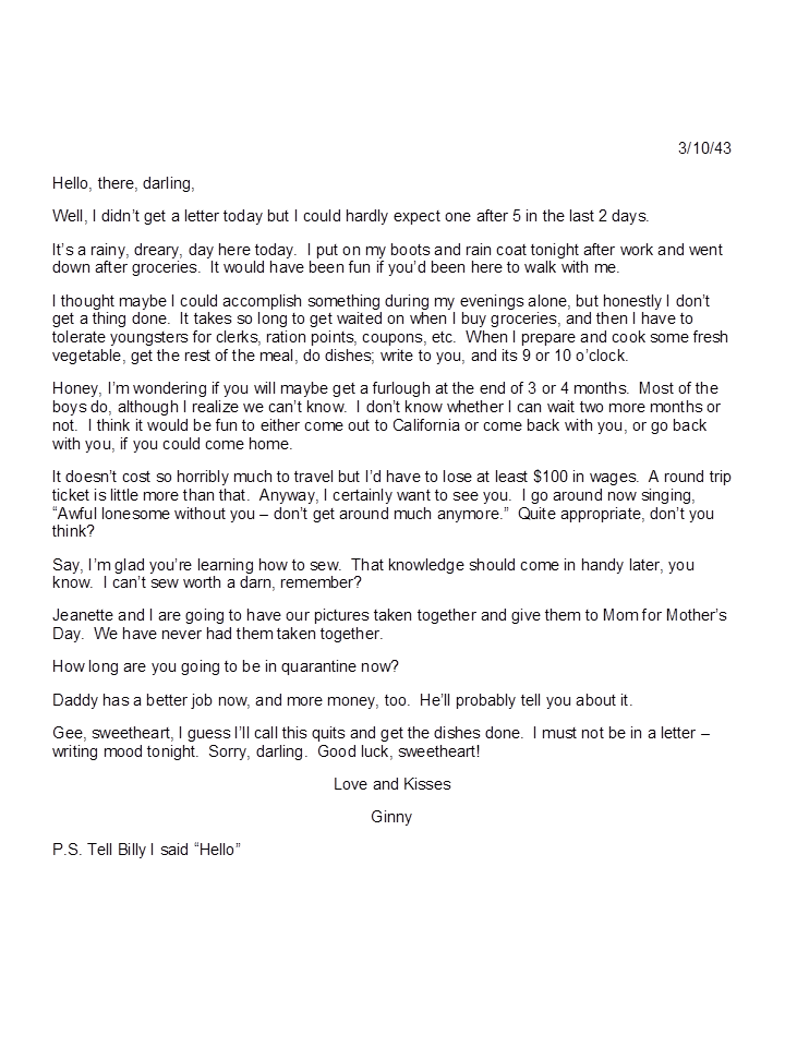 March 10, 1943, Geneva to Harold